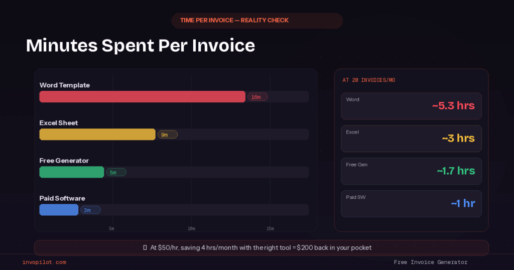 So at twenty invoices monthly, you’re looking at four to six hours with templates, maybe ninety minutes with modern free tools, about an hour with paid software.