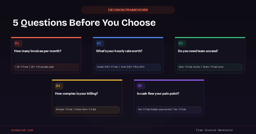 Evaluate paid options when free tools become genuine limitations – probably around thirty invoices monthly or when automation would save significant time.