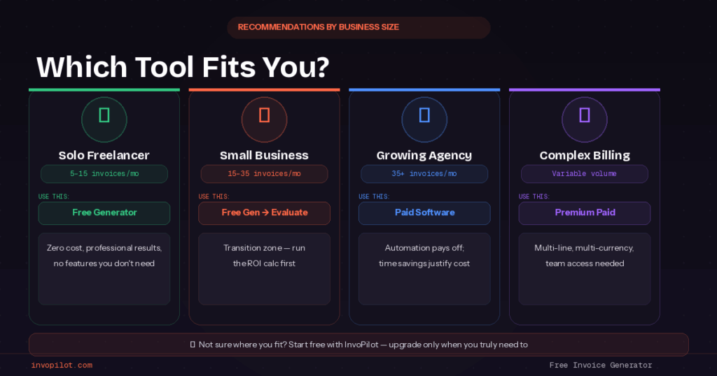 Start with InvoPilot or similar modern free generator for the first six months. Focus on establishing consistent billing processes and understanding actual needs rather than projected requirements.